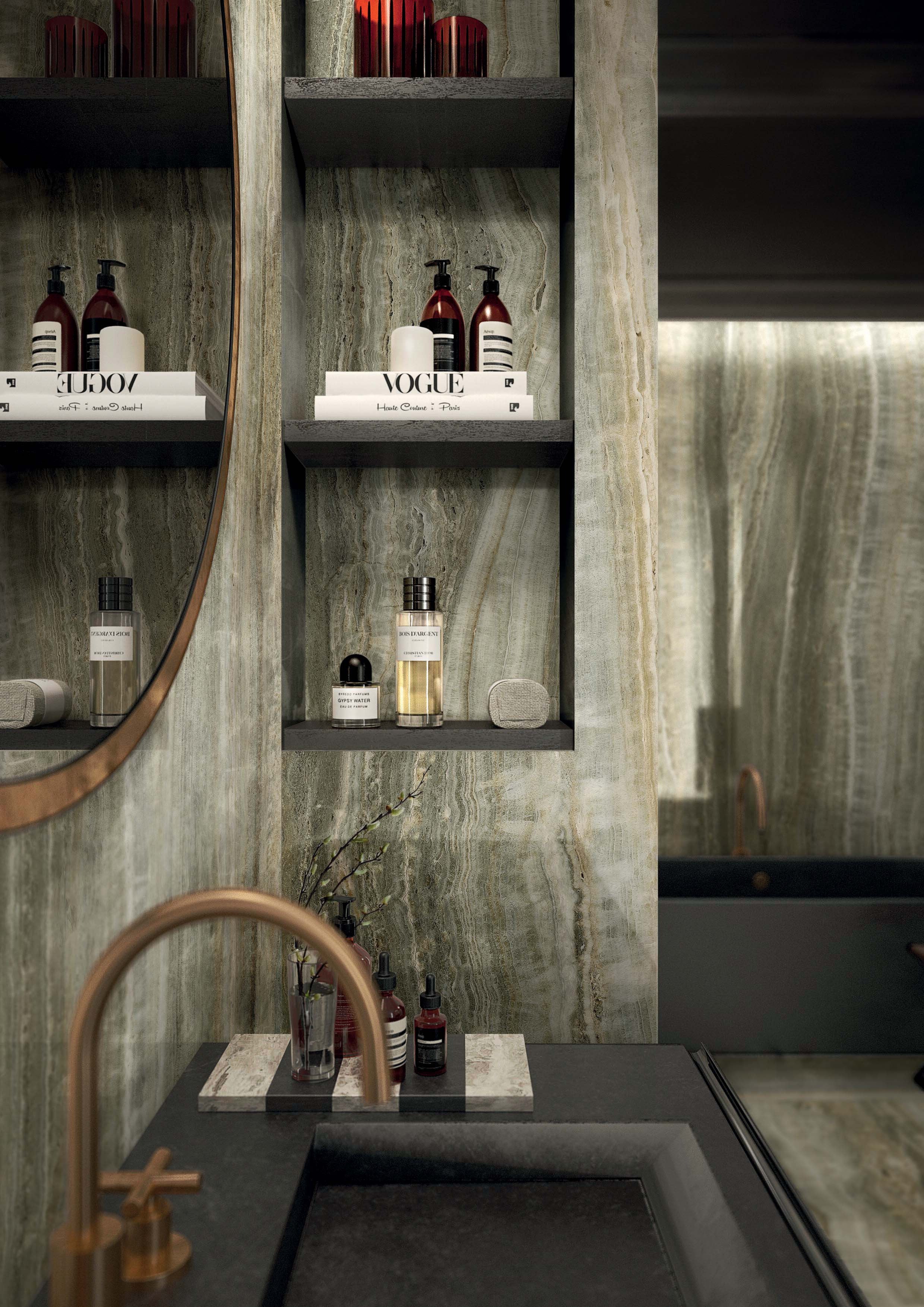 Designed to make a bold statement, Eccentric Lux Sage transforms any interior into a sanctuary of refined elegance. Whether used on walls or floors, its large-format size minimizes grout lines, creating a seamless, fluid look that amplifies light and space. The intricate veining and rich tonal variation give each tile a distinctive personality — sophisticated, organic, and utterly captivating.