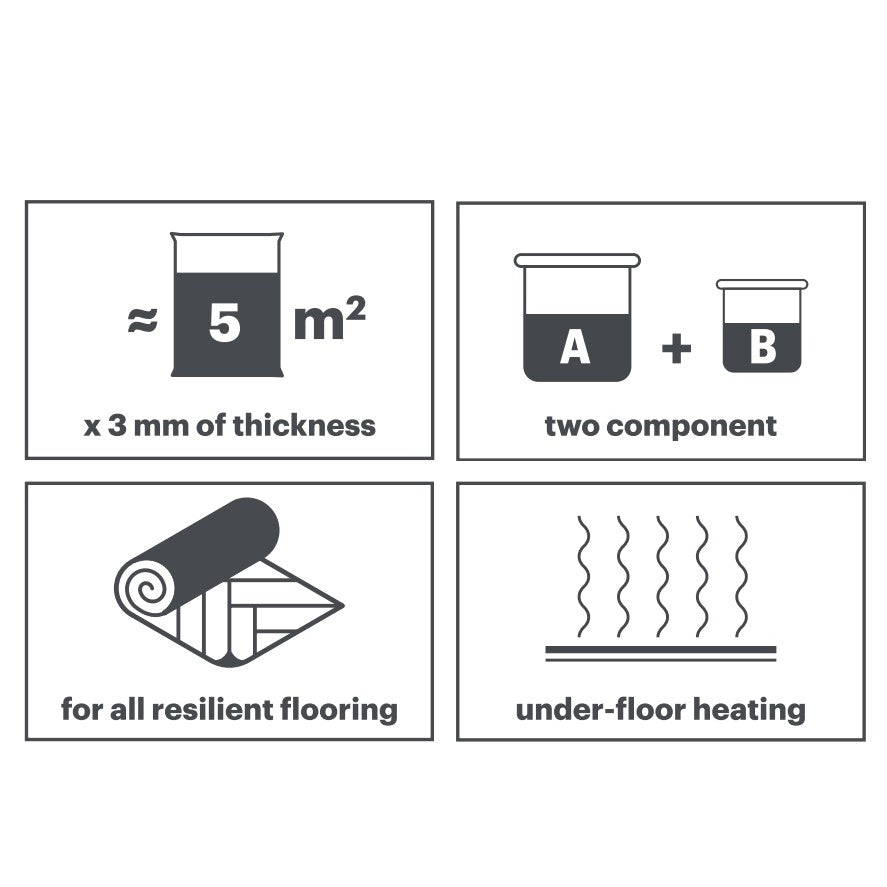 double component smoothing compound. Free flowing substrate preparation before laying resilient flooring. 4 hours until foot traffic - 12 hours until ready to receive floor covering **site condition / substrates may effect drying times**
