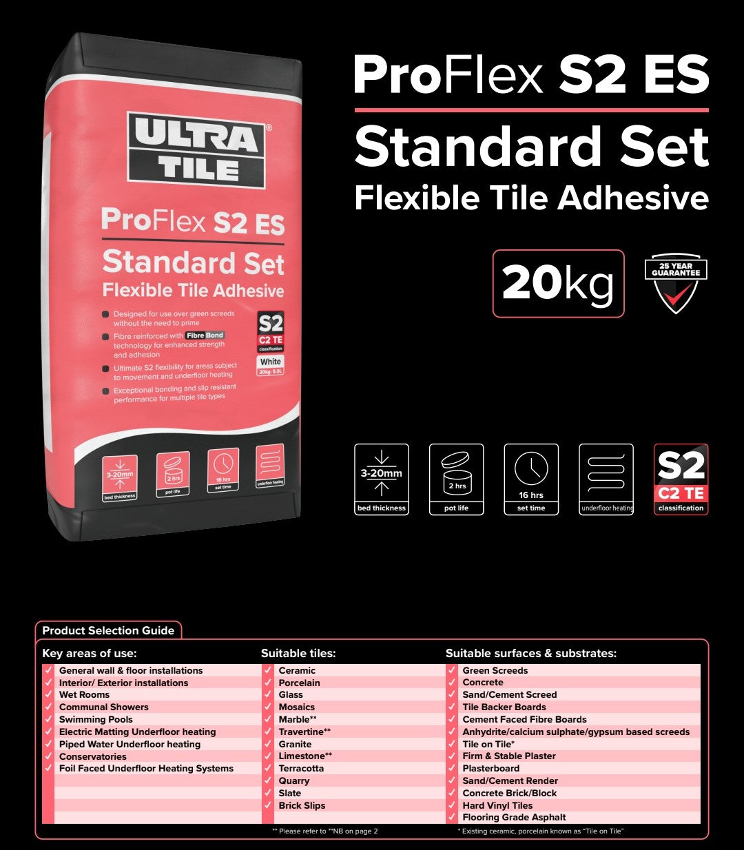 UltraTileFix ProFlex ES S2 is a single-part, standard setting, highly flexible, fibre-reinforced adhesive for wall and floor tiles.